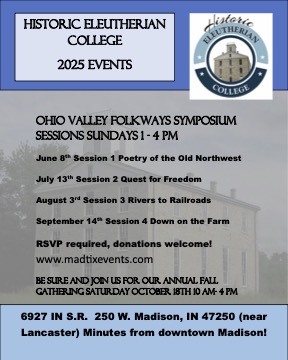 This summer, we are introducing the Ohio Valley Folkways Symposium Sessions. From 1-4 p.m. on various Sunday’s, joins us for a powerful afternoon of storytelling, history, art, and poetry, hosted on the grounds of Historic Eleutherian College. Let the stories of the Ohio Valley move you — from riverbanks to railways.
